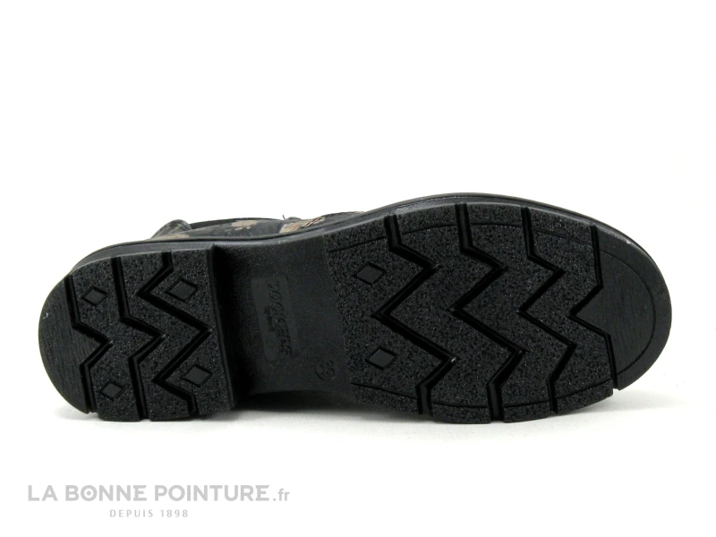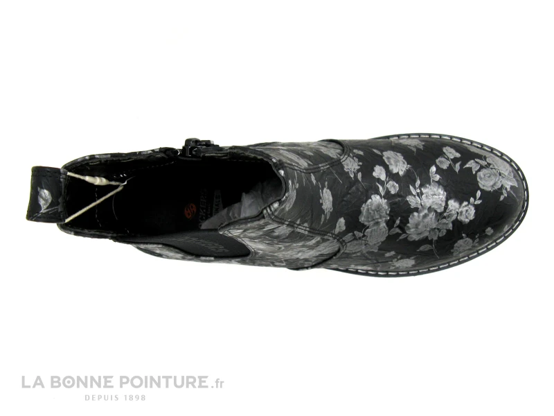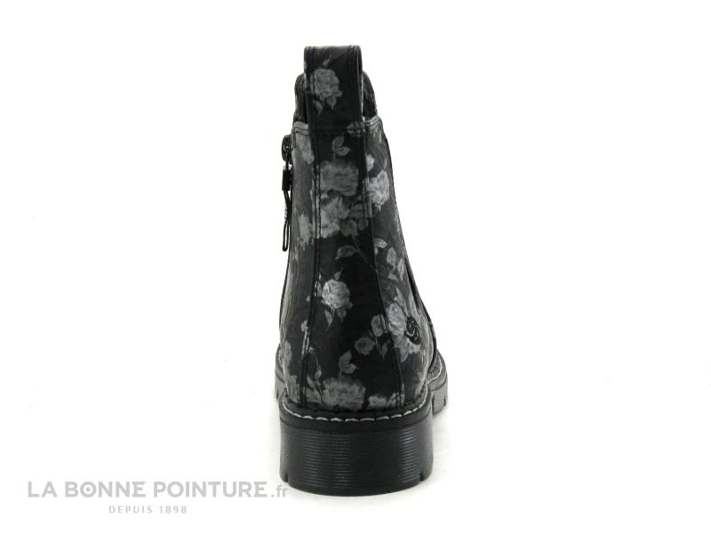 Cette bottine Dockers Femme est en simili noir aspect légèrement froissé, imprimé de fleurs aux tons de gris argenté et de doré.