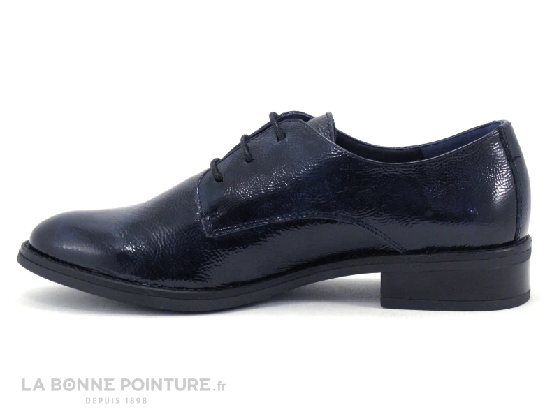 Cette chaussure basse Femme Dorking by Fluchos est en cuir verni bleu foncé, avec de légères nuances et un aspect froissé qui caractérisent le derbi.