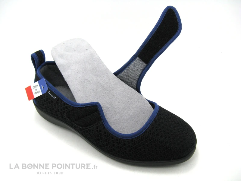 Ce chausson femme est en textile respirant noir avec une bordure bleu marine.
