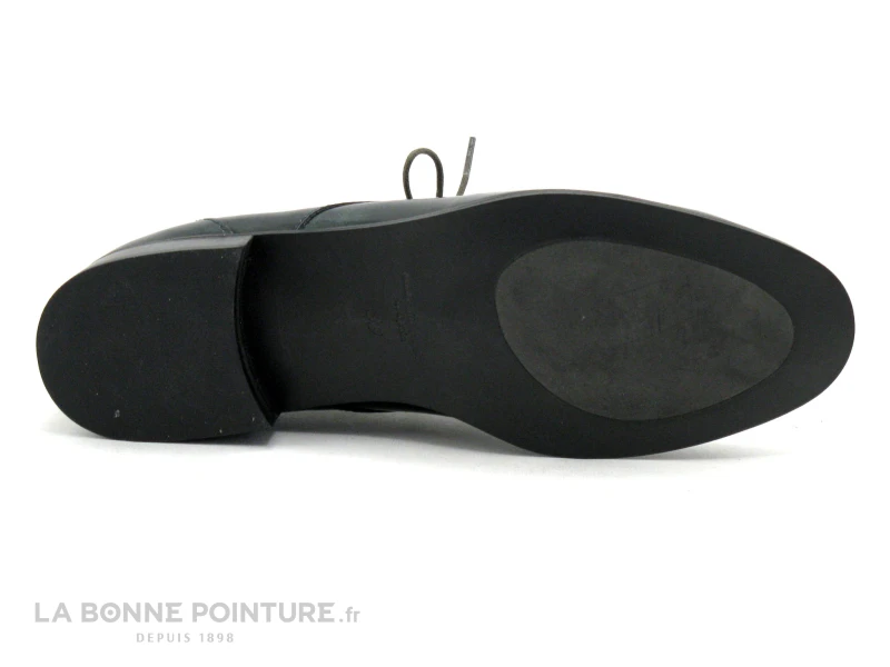 Ce derby mode Femme est en cuir verni vert foncé, avec de légères nuances et des petits cercles perforés sur l’avant qui laissent apparaître du gris métal.