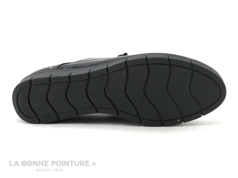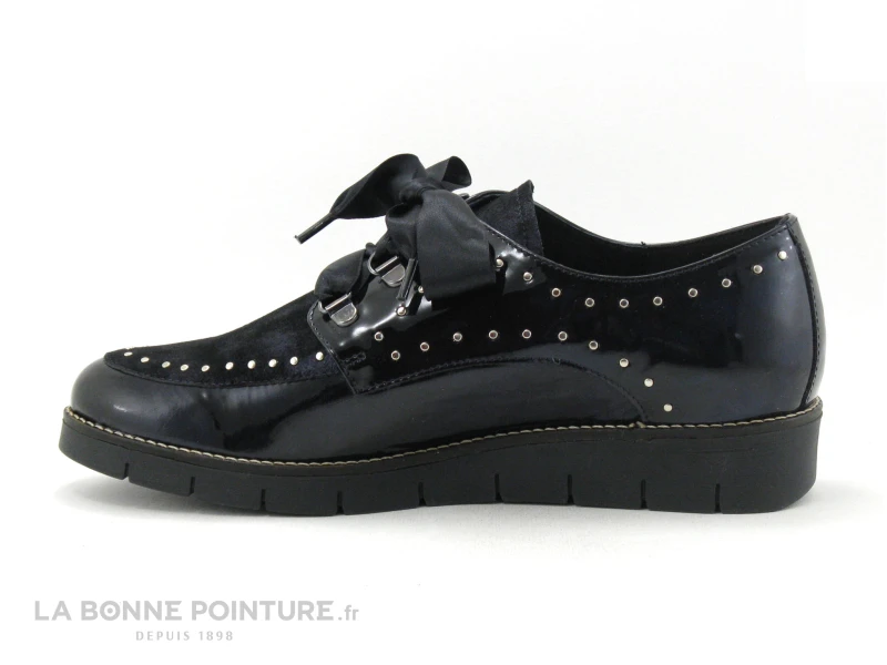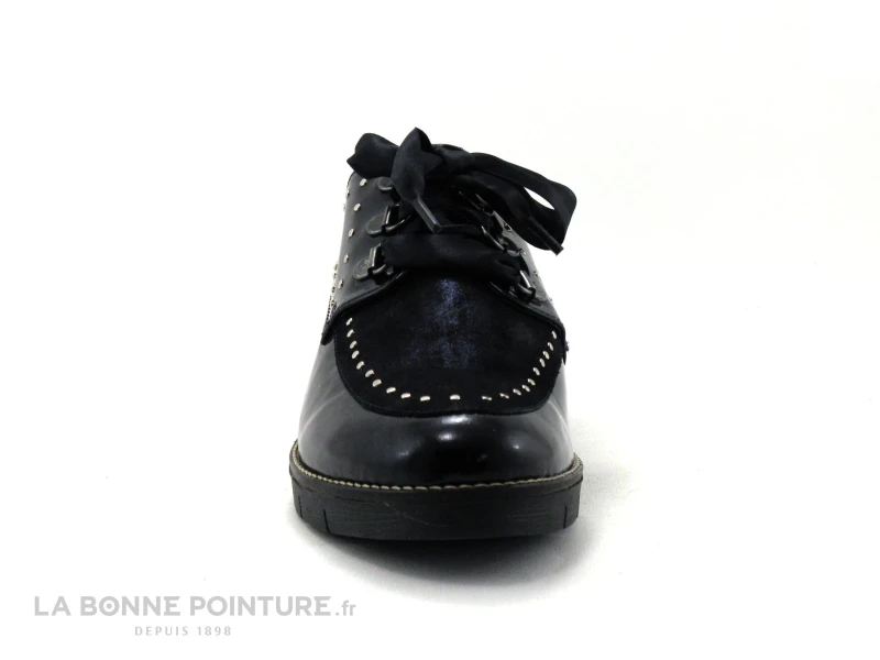 Ce derbi Femme est en cuir verni bleu marine, avec le dessus en cuir velours bleu métallisé.