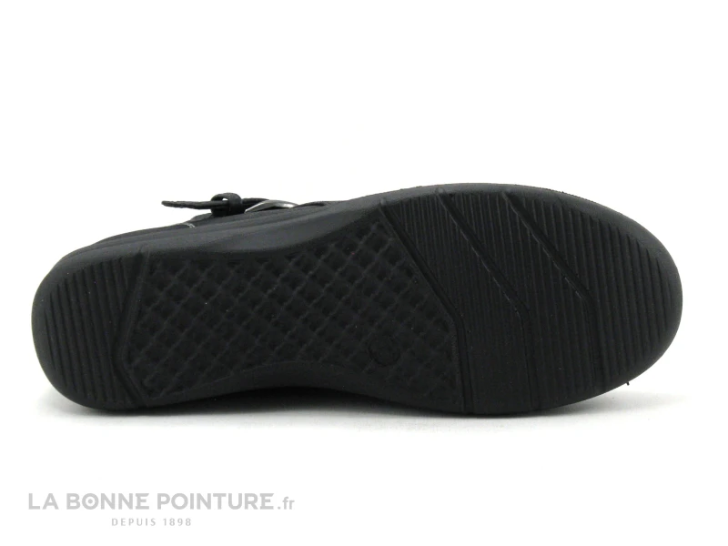 Cette bottine basse Femme est en simili cuir noir, Ă l’aspect lĂ©gèrement brillant sur fond mat.