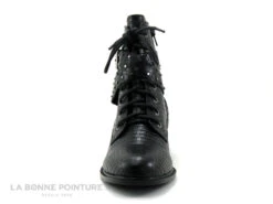 Cette chaussure montante Femme Divine Factory est toute noire, avec des dĂ©coupes fantaisie Ă l’arriĂšre ainsi qu’une partie aspect reptile.